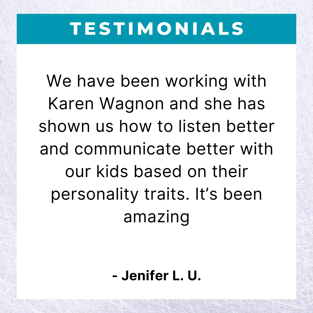 I learned so much about my own personality features as well as my daughters. This program will work for any parent and child combination. Parenting By Design, with the coaching of Karen Wagnon, will get you and your child to a better,